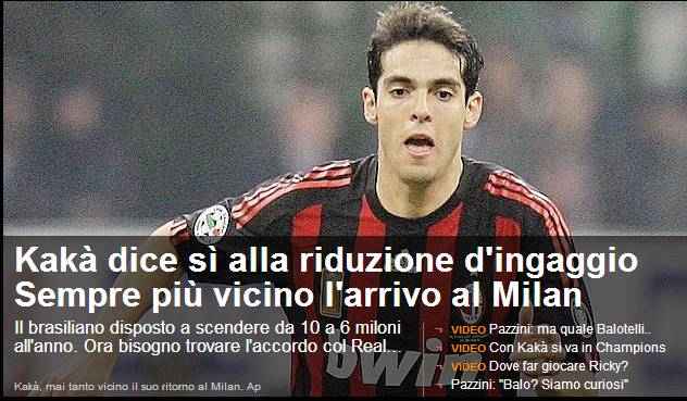 CALCIOMERCATO MILAN – Ampio risalto sui principali portali sportivi online alla vicenda Kakà-Milan. Andando a visionare le home page di Gazzetta.it, Corrieredellosport.it, e Goal.com, tre fra i principali siti web che si occupano di calcio, si scopre come la recente notizia riguardante la decurtazione dell’ingaggio di Kakà da parte dei rossoneri sia la notizia in primo piano. Il brasiliano ha quindi fatto un passo indietro, avvicinandosi al Milan, ed ora toccherà al Real Madrid dire sì alla richiesta di prestito dei vice-campioni d’Italia.
