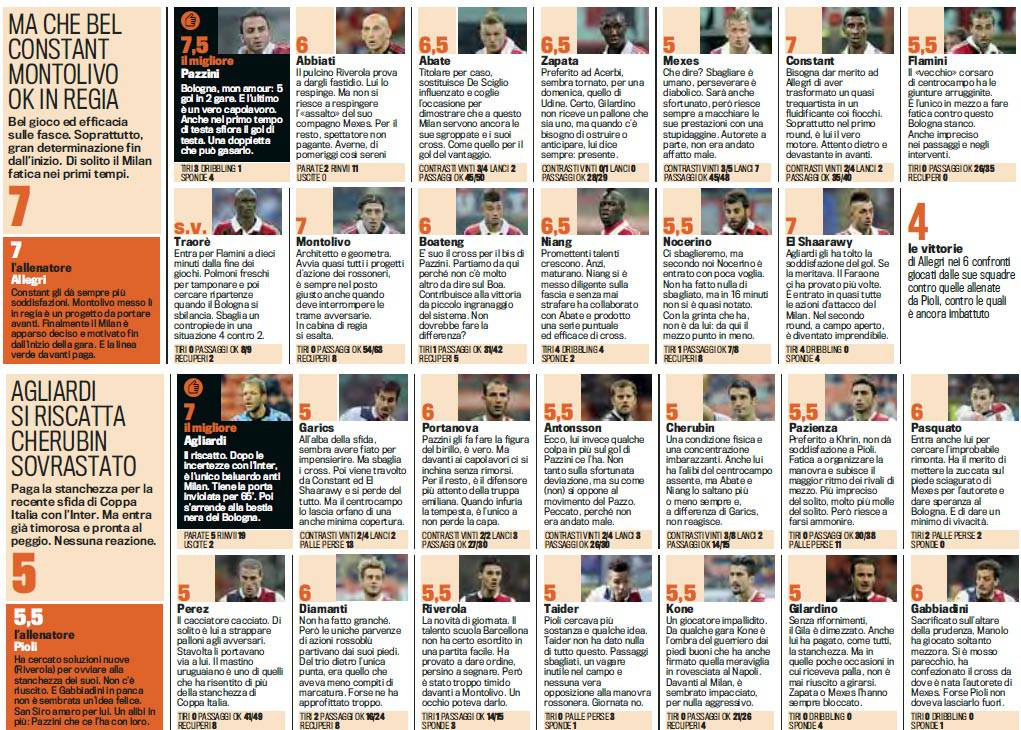 MILAN BOLOGNA VOTI PAGELLE GAZZETTA – Piu’ in basso potrete visionare i voti e le pagelle Gazzetta dello Sport di Milan-Bologna, gara giocatasi ieri pomeriggio allo stadio San Siro e conclusasi con il risultato di 2 a 1 in favore dei rossoneri. Migliore in campo in assoluto, è Giampaolo Pazzini, autore ieri di due reti fondamentali per la vittoria del Diavolo. Molto bene anche Kevin Constant (voto 7 per lui), nonchè Riccardo Montolivo, sempre più leader di questo Milan e ieri schierato nella posizione di regista davanti alla difesa. El Shaarawy è ormai una conferma mentre male Mexes, protagonista in negativo con un autorete.