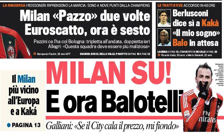 Rassegna stampa Milan: più vicina l’Europa, ed ora Balotelli e Kakà il sogno di Berlusconi – Foto 22/01/2013 - 09:5621/01/2013 - 07:08 di Redazione2 RASSEGNA STAMPA MILAN FOTO – Di seguito potete trovare i principali titoli dei tre quotidiani sportivi, La Gazzetta dello Sport, Corriere dello Sport e Tuttosport, riguardanti naturalmente il nostro Milan. La redazione di Milanlive.it