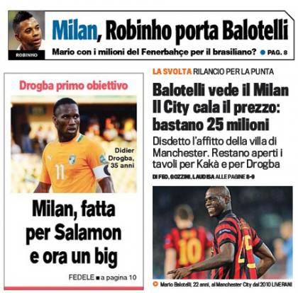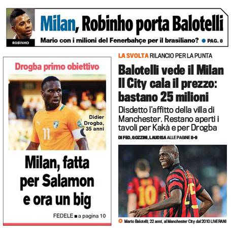 Rassegna stampa Milan: Per Balotelli servono solo 25 milioni, lo porta Robinho, fatta per Salamon ora un big! – Foto 25/01/2013 - 19:2724/01/2013 - 07:07 di Redazione2 RASSEGNA STAMPA MILAN FOTO – Di seguito potete trovare i principali titoli dei tre quotidiani sportivi, La Gazzetta dello Sport, Corriere dello Sport e Tuttosport, riguardanti naturalmente il nostro Milan. La redazione di Milanlive.it