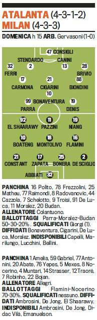 ATALANTA MILAN PROBABILI FORMAZIONI – Di seguito potrete visionare le probabili formazioni di Atalanta-Milan firmate Gazzetta dello Sport. Allegri sembra intenzionato a confermare il tridente d’attacco delle ultime uscite, El Shaarawy, Niang Pazzini. A centrocampo, Montolivo andrà ancora in cabina di regia spalleggiato da Boateng e Flamini. In difesa, infine, coppia di centrali Zapata-Bonera con De Sciglio e Constant come al solito sulle due corsie. La porta sarà affidata a Christian Abbiati, tornato titolare dopo alcune titubanze nelle scorse settimane, con Amelia naturalmente in panca.