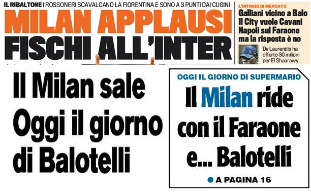 Rassegna stampa Milan: il Napoli offre 30 milioni per il Faraone, oggi è il giorno di Balotelli! – Foto 28/01/2013 - 19:0128/01/2013 - 07:06 di Redazione2 RASSEGNA STAMPA MILAN FOTO – Di seguito potete trovare i principali titoli dei tre quotidiani sportivi, La Gazzetta dello Sport, Corriere dello Sport e Tuttosport, riguardanti naturalmente il nostro Milan. La redazione di Milanlive.it