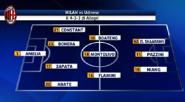 MILAN UDINESE ULTIMISSIME FORMAZIONI – Manca solo la conferma ma Mario Balotelli dovrebbe partire dalla panchina nella sfida in programma questa sera fra il Milan e l’Udinese. Mister Massimiliano Allegri sembra infatti intenzionato a schierare Pazzini, Niang ed El Shaarawy e manca solo la conferma. Grande dubbio in porta dove dovrebbe giocare Marco Amelia in favore di Christian Abbiati, quest’ultimo, influenzato. Out anche De Sciglio quindi sulla destra giocherà Ignazio Abate mentre a sinistra toccherà a Kevin Constant. Infine il centrocampo con Montolivo in regia supportato da Flamini e Boateng.