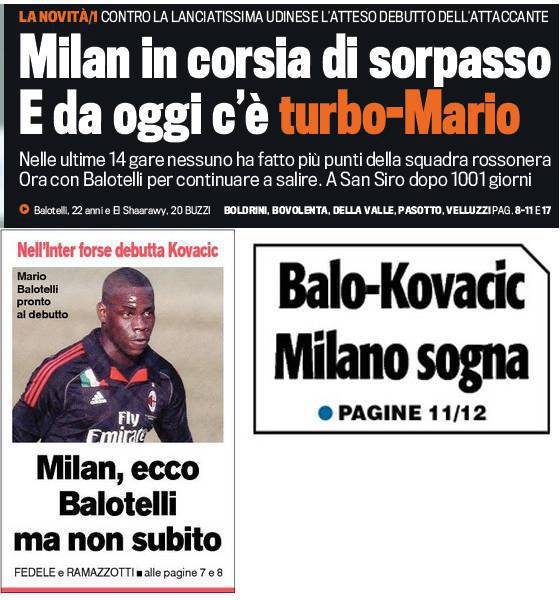 Rassegna stampa Milan: Milan in corsia di sorpasso e da oggi c’è Turbo Mario, ma non da subito… – Foto 05/02/2013 - 12:4103/02/2013 - 07:57 di Redazione2 RASSEGNA STAMPA MILAN FOTO – Di seguito potete trovare i principali titoli dei tre quotidiani sportivi, La Gazzetta dello Sport, Corriere dello Sport e Tuttosport, riguardanti naturalmente il nostro Milan. La redazione di Milanlive.it