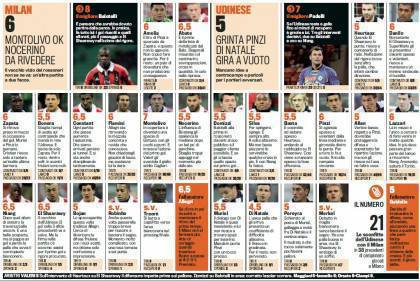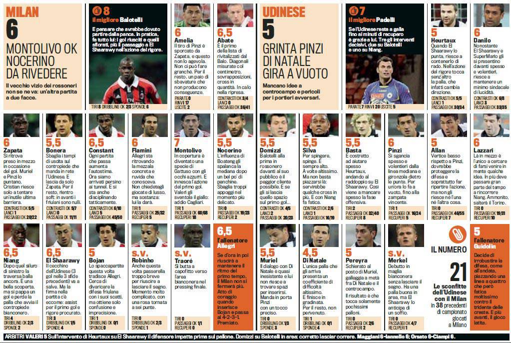 MILAN UDINESE VOTI PAGELLE GAZZETTA – Di seguito potete visionare i voti e le pagelle firmati Gazzetta dello Sport di Milan-Udinese, partita che si è giocata ieri sera allo stadio San Siro e si è conclusa con il risultato di due a 1 per i rossoneri. Assoluto protagonista e migliore dell’incontro è Mario Balotelli. Per lui due reti ed un esordio favoloso con la nuova casacca del Diavolo, premiato dalla Rosea con un bell’8. Grande partita anche di Riccardo Montolivo, sempre più leader del centrocampo. Non bene Nocerino (5,5) così come Bojan (5).