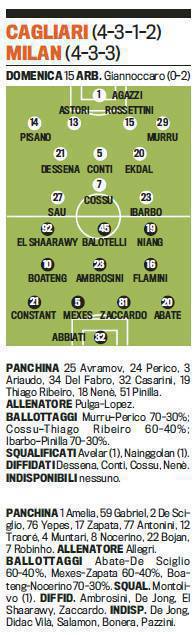 CAGLIARI MILAN PROBABILI FORMAZIONI – Poco più in basso potrete visionare le probabili formazioni firmate Gazzetta dello Sport di Cagliari-Milan, sfida che si giocherà domenica pomeriggio alle ore 15.00. Qualche problema per Allegri che dovrà fare a meno di Montolivo, squalificato, nonchè di Pazzini, infortunatosi. Incerto anche Boateng, influenzato nelle ultime ore. In regia dovrebbe giocare Ambrosini, tornato arruolabile dopo gli acciacchi delle ultime settimane, mentre al centro difesa potrebbe vedersi per la prima volta Zaccardo, visto che Bonera è out e Yepes e Zapata sono reduci dall’amichevole con la Colombia. In porta, infine, torna Abbiati.