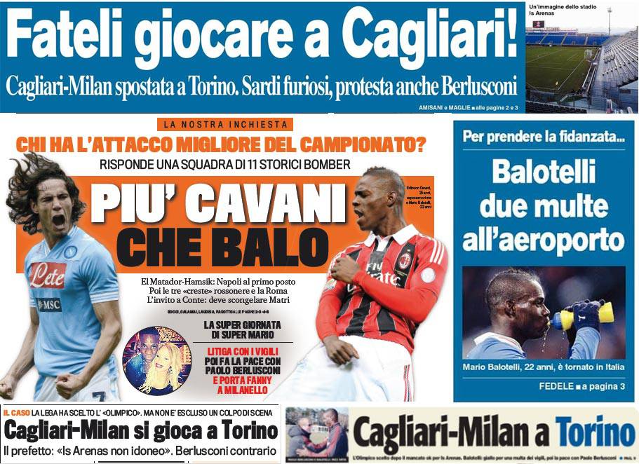 Rassegna stampa Milan: fateli giocare a Cagliari! Berlusconi spinge per l’Is Arenas, più Cavani che Balo… – Foto 10/02/2013 - 19:1608/02/2013 - 07:08 di Redazione2 RASSEGNA STAMPA MILAN FOTO – Di seguito potete trovare i principali titoli dei tre quotidiani sportivi, La Gazzetta dello Sport, Corriere dello Sport e Tuttosport, riguardanti naturalmente il nostro Milan. La redazione di Milanlive.it