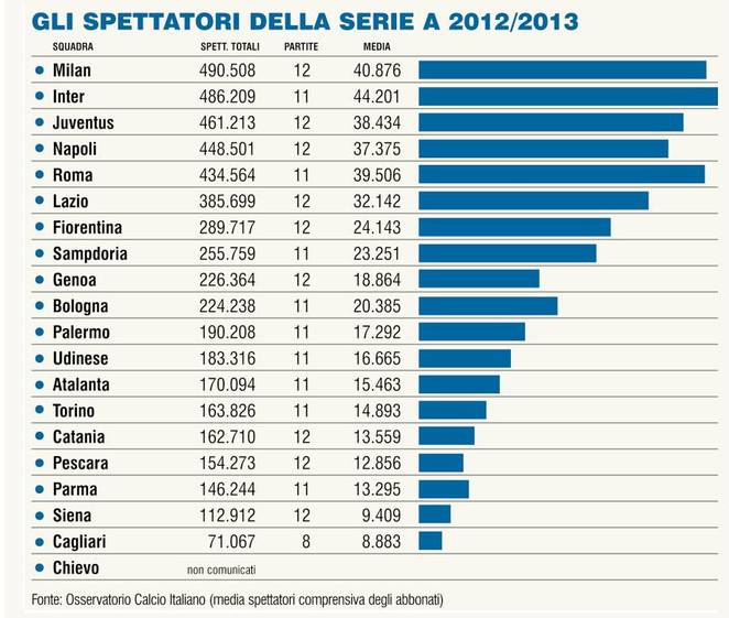 SPETTATORI SERIE A – La redazione de Il Corriere dello Sport ha realizzato un grafico per analizzare gli spettatori negli stadi di Serie A durante la stagione in corso. Il Milan risulta al primo posto per il numero totale di spettatori (490.508) mentre è al secondo per la media totale di presenze a San Siro (40.876). Un dato che in realtà non rispecchia in pieno il “clima” che si è vissuto allo stadio in questa prima metà stagionale e che deriva dalla capienza dello stadio Meazza, il più grande d’Italia. Il Milan quest’anno ha infatti giocato, spesso e volentieri, in un San Siro semi vuoto complice la campagna abbonamenti davvero di magra derivante da un mercato estivo di svendita.