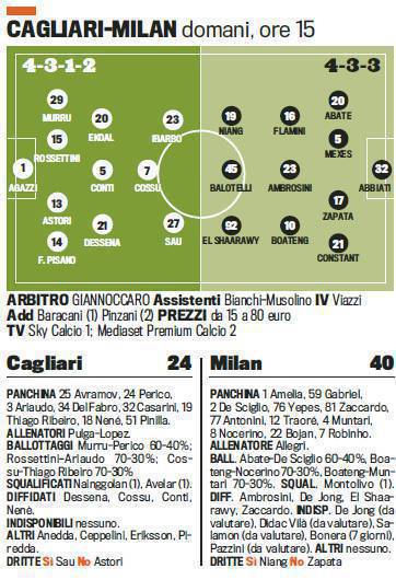 CAGLIARI MILAN PROBABILI FORMAZIONI – Poco più in basso potrete visionare le probabili formazioni di Cagliari-Milan firmate Gazzetta dello Sport. La gara si giocherà domani pomeriggio all’Is Arenas dopo le diatribe degli scorsi giorni. Allegri sembra voler confermare il classico 4-3-3 ma attenzione anche all’idea dell’ultima ora, quella di un tridente El Shaarawy, Niang, Balotelli, supportato da Bojan. Un vero e proprio poker d’attacco, difficilmente utilizzabile dal primo minuto, ma percorribile in corso d’opera. Vedremo se Allegri utilizzerà o meno tale modulo nel frattempo stazionerà in regia Ambrosini (Montolivo è squalificato) mentre in difesa dovrebbero giocare Mexes e Zapata.