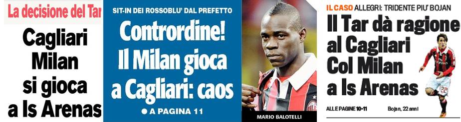 Rassegna stampa Milan: Cagliari-Milan si gioca a Is Arenas, tridente più Bojan… – Foto 10/02/2013 - 19:1509/02/2013 - 07:09 di Redazione2 RASSEGNA STAMPA MILAN FOTO – Di seguito potete trovare i principali titoli dei tre quotidiani sportivi, La Gazzetta dello Sport, Corriere dello Sport e Tuttosport, riguardanti naturalmente il nostro Milan. La redazione di Milanlive.it