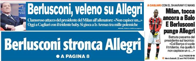 Rassegna stampa Milan: Berlusconi veleno su Allegri, il presidente punge il tecnico, tocca ancora a Balo – Foto 10/02/2013 - 19:1410/02/2013 - 07:32 di Redazione2 RASSEGNA STAMPA MILAN FOTO – Di seguito potete trovare i principali titoli dei tre quotidiani sportivi, La Gazzetta dello Sport, Corriere dello Sport e Tuttosport, riguardanti naturalmente il nostro Milan. La redazione di Milanlive.it
