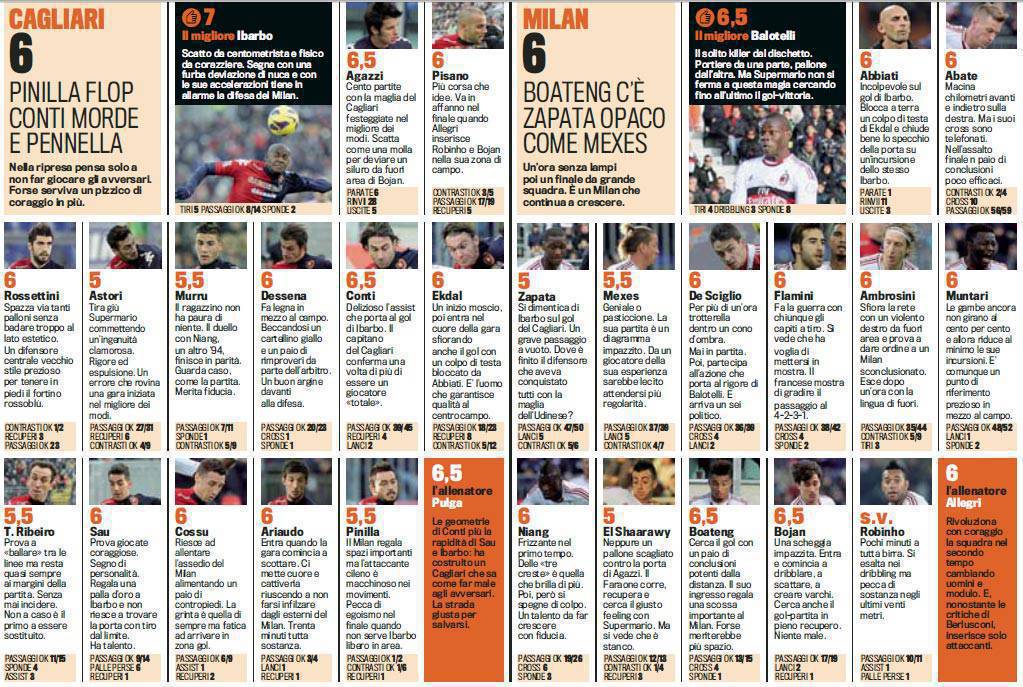 CAGLIARI MILAN VOTI PAGELLE GAZZETTA – Poco più in basso potrete osservare i voti e le pagelle firmate Gazzetta dello Sport di Cagliari-Milan, gara che si è giocata ieri pomeriggio all’Is Arenas e conclusasi con il risultato di parità, per a 1 a 1. Nuova buona prova di Mario Balotelli, in rete anche ieri dopo la doppietta all’esordio, e vicino al gol in un altro paio di occasioni. Sotto tono invece El Shaarawy, visibilmente affaticato dopo una serie di partite che non hanno dato sosta al Faraone. Male anche Zapata, colpevole sulla rete di Ibarbo (il migliore in assoluto della partita).