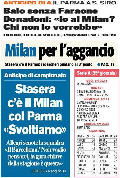 Rassegna stampa Milan: il Milan contro il Parma per l’aggancio, Donadoni “chiama” – Foto 15/02/2013 - 07:08 di Redazione2 RASSEGNA STAMPA MILAN FOTO – Di seguito potete trovare i principali titoli dei tre quotidiani sportivi, La Gazzetta dello Sport, Corriere dello Sport e Tuttosport, riguardanti naturalmente il nostro Milan. La redazione di Milanlive.it