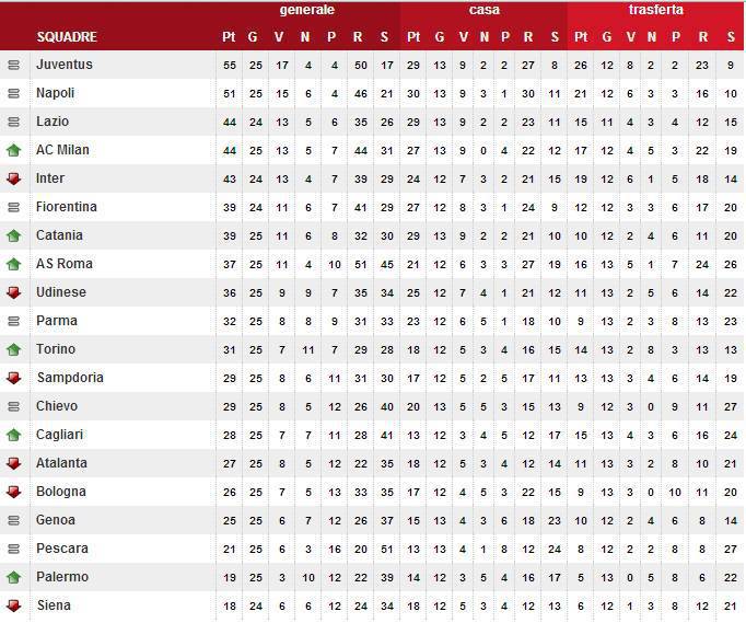 SERIE A – Di seguito potete trovare la nuova classifica di Serie A in attesa di Inter e Lazio che scenderanno in campo questa sera e lunedì. Il Napoli pareggia in casa con la Samp (0 a 0) e il Milan si porta quindi a -7 dal secondo posto e a -11 dal primo posto dopo la sconfitta della Juventus contro la Roma.