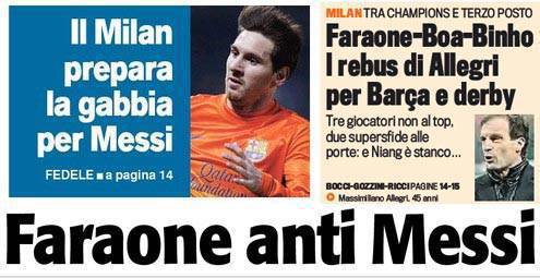 Rassegna stampa Milan: Faraone-Boa-Binho i rebus di Allegri, si prepara la gabbia a Messi – Foto 26/02/2013 - 19:2218/02/2013 - 07:05 di Redazione2 RASSEGNA STAMPA MILAN FOTO – Di seguito potete trovare i principali titoli dei tre quotidiani sportivi, La Gazzetta dello Sport, Corriere dello Sport e Tuttosport, riguardanti naturalmente il nostro Milan. La redazione di Milanlive.it