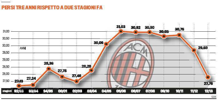 MILAN GIOVANE – Interessante iconografica pubblicata stamane da La Gazzetta dello Sport per sottolineare l’età media del Milan. Da 10 anni a questa parte il Milan non è mai stato così giovane in Champions League, tenendo conto che nella sfida di mercoledì sera scenderanno in campo molto probabilmente De Sciglio, El Shaarawy e Niang. Nell’ultimo ventennio, invece, solo tre volte i rossoneri sono stati più “piccoli” di adesso, e precisamente nel 1992-1993, nel 1993-1994 e infine nel 2002-2003.