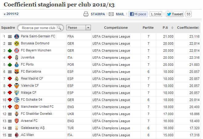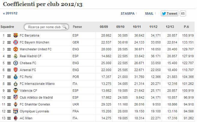 RANKING UEFA PER CLUB – Di seguito pubblichiamo i Ranking Uefa per Club dopo le gare di Champions League di ieri. Al Milan servirebbe una vittoria per risalire nella top 10.