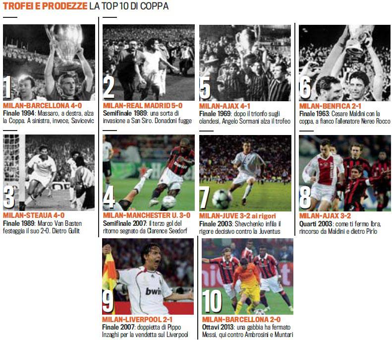 FOTONOTIZIA – La Gazzetta dello Sport ha pubblicato stamane una splendida notizia in cui ha ripercorso le 10 vittorie più spettacolari e nel contempo importanti relative alla storia del Milan in Coppa. Non può mancare naturalmente l’ultimo grande successo contro il Barcellona, ma ve ne sono anche degli altri davvero memorabili: eccoli di seguito, voi quali preferite?