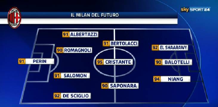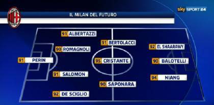 CALCIOMERCATO MILAN – Il Milan delle prossime stagioni cercherà di attingere sempre più dal proprio vivaio e nel contempo di assicurarsi nuovi talenti, innestando quindi di linfa vitale giovane la squadra attuale. La redazione di Sky Sport, seguendo questo diktat, ha provato ad ipotizzare quello che potrebbe essere il Milan 2013-2014. L’11 titolare potrebbe essere composto da l’ottimo Perin in porta, attualmente al Pescara ma di proprietà del Genoa, e che il Milan ha già sondato più volte. Difesa con De Sciglio e Salamon, già del Milan, con l’aggiunta dei talenti Albertazzi e Romagnoli. A centrocampo, Cristante, Saponara e il baby del Genoa, Bertolacci. Infine l’attacco, che rimane identico a quello attuale, El Shaarawy, Balotelli e Niang.