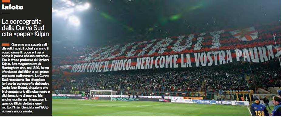 FOTO INTER MILAN COREOGRAFIA – Dopo la grande prova contro il Barcellona i tifosi del Milan si ripetono, sfoggiando un’altra spettacolare coreografia. In occasione del derby i supporters rossoneri hanno esposto un mega striscione, grande quanto tutta al Curva Sud, con parte della famosa frase di Kilpin, il fondatore del Milan. Sullo striscione si leggeva “Rossi come il fuoco… neri come la vostra paura”, un urlo di battaglia che purtroppo non è bastato per ottenere la vittoria.