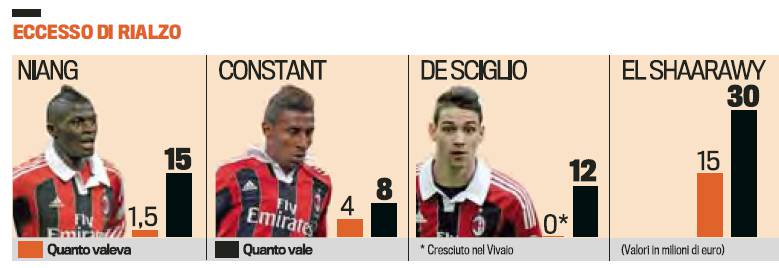 CALCIOMERCATO MILAN – Splendida “inchiesta” realizzata stamane da La Gazzetta dello Sport sull’aumento di valore di alcuni componenti del Milan attuale, una valorizzazione dovuta all’ottimo lavoro di Allegri, che ha saputo impiegare al meglio gli uomini a disposizione, iniziando un nuovo corso dopo quello dei big e dei senatori. Quattro sono in particolare gli emblemi del Milan di oggi: Niang, El Shaarawy, De Sciglio e Constant. Il francese è passato da 1,5 a 15 milioni di euro di valore; El Shaarawy, da 15 a 30; De Sciglio è costato zero, venendo dal vivaio, ed ora vale 12; infine Constant, il cui valore è raddoppiato da 4 a 8.