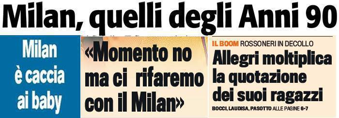Rassegna stampa Milan: ecco il Milan degli anni ’90, momento no del Barca, Allegri valorizza i suoi – Foto 12/03/2013 - 19:2428/02/2013 - 07:07 di Redazione2 RASSEGNA STAMPA MILAN FOTO – Di seguito potete trovare i principali titoli dei tre quotidiani sportivi, La Gazzetta dello Sport, Corriere dello Sport e Tuttosport, riguardanti naturalmente il nostro Milan. La redazione di Milanlive.it