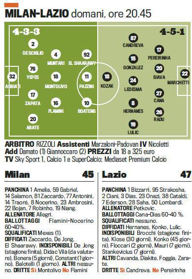 MILAN LAZIO PROBABILI FORMAZIONI – Poco più in basso potrete visionare le probabili formazioni di Milan-Lazio firmate Gazzetta dello Sport. Per la sfida in programma domani sera Allegri potrebbe fare a meno di Balotelli il cui ginocchio è ancora dolorante dopo il derby. Le sue condizioni verranno attentamente tenute sotto controllo nelle prossime ore e non è da escludere che alla fine Super Mario possa dare forfeit. Al suo posto potrebbe giocare Pazzini affiancato da El Shaarawy e Boateng. A centrocampo, Montolivo, con Muntari e Flamini, mentre in difesa, De Sciglio sulla sinistra al posto dell’infortunato Constant, con Zapata-Yepes a centro difesa. Moltissime assenze in casa Lazio, fra cui Klose, Konko, Floccari e Mauri.