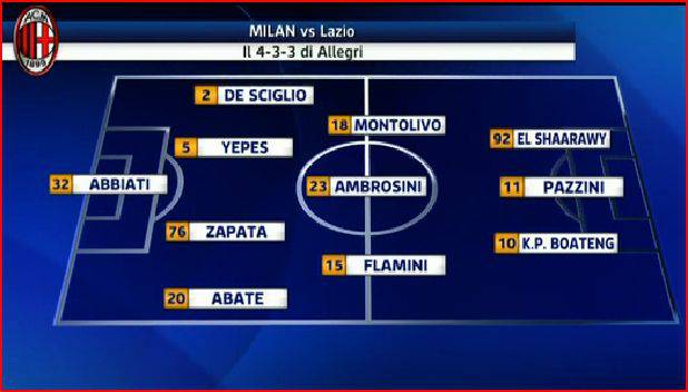 MILAN LAZIO ULTIME FORMAZIONI – Possibile “novità” in casa Milan in vista della sfida contro la Lazio di questa sera. Da come sottolinea la redazione di Sky Sport Allegri sembra intenzionato a schierare Ambrosini in cabina di regia spalleggiato da Flamini e Montolivo, e non, come si pensava nelle scorse ore, Monto in regia con Muntari e Flamini a supporto. Il ghanese dovrebbe quindi rimanere a riposo e fresco per i prossimi due impegni contro il Genoa, il prossimo weekend, e soprattutto, per il ritorno degli ottavi di finale di Champions contro il Barca.