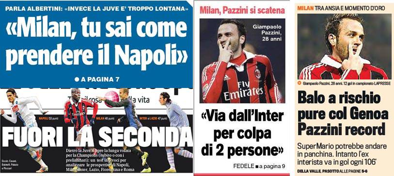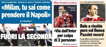 Rassegna stampa Milan: Balo a rischio col Genoa, Pazzini e la verità sull’addio, il Milan prende il Napoli – Foto 12/03/2013 - 19:2005/03/2013 - 07:12 di Redazione2 RASSEGNA STAMPA MILAN FOTO – Di seguito potete trovare i principali titoli dei tre quotidiani sportivi, La Gazzetta dello Sport, Corriere dello Sport e Tuttosport, riguardanti naturalmente il nostro Milan. La redazione di Milanlive.it