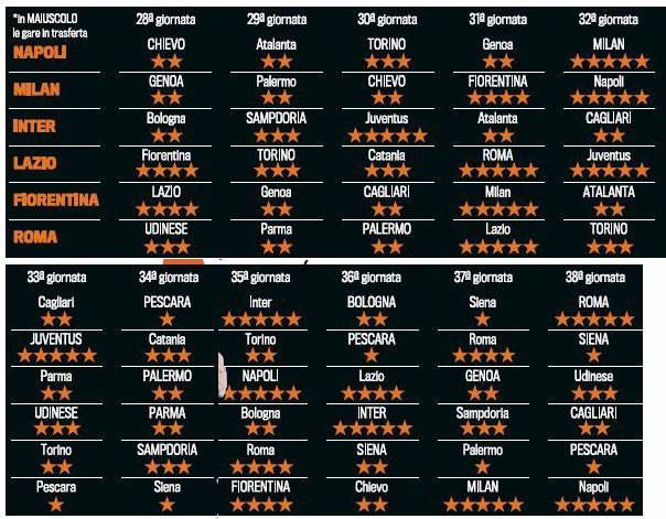 FOTONOTIZIA – La corsa Champions League è apertissima. Il Milan punta dritto al secondo posto del Napoli, squadra che dista sole cinque lunghezze, ma nel contempo deve guardarsi alle spalle, visto che l’Inter è tutt’altro che morta, la Lazio è costante da inizio stagione e la Roma e la Fiorentina paiono in ripresa. Sono quindi sei le squadre in corsa per due posti e La Gazzetta dello Sport ha pubblicato il calendario di tutti i prossimi impegni di Serie A, dal prossimo weekend alla fine della stagione, per cercare di capire quale delle sei formazioni avrà le partite più agevoli.