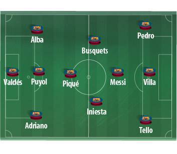 BARCELLONA MILAN – E’ gia’ pronto l’11 del Barcellona che scenderà in campo la prossima settimana al Camp Nou per sfidare il Milan, gara valevole per il ritorno degli ottavi di Champions League. Vilanova ha in mente un iper offensivo 3-3-4 con qualche novità rispetto alla gara dell’andata a cominciare dalla presenza nel tridente d’attacco di David Villa, all’epoca infortunato, al fianco di Pedro e del giovane Tello con Lionel Messi in posizione di trequartista. Assenza pesante di Xavi che sarà sostituto da Pique in regia supportato da Busquets e Iniesta. Infine la difesa con Puyol, Alba e Adriano.