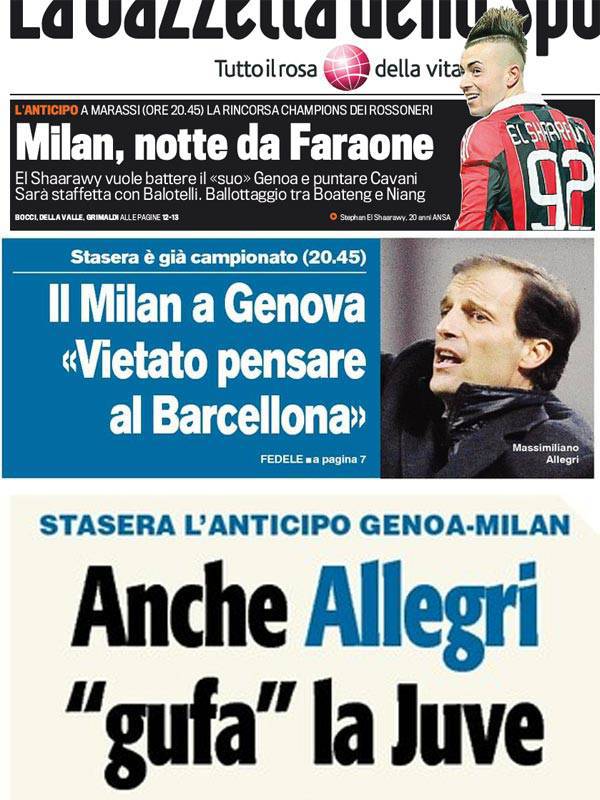 Rassegna stampa Milan: Notte da Faraone, Allegri “gufa” la Juve, vietato pensare al Barca – Foto 11/03/2013 - 19:2508/03/2013 - 07:11 di Redazione2 RASSEGNA STAMPA MILAN FOTO – Di seguito potete trovare i principali titoli dei tre quotidiani sportivi, La Gazzetta dello Sport, Corriere dello Sport e Tuttosport, riguardanti naturalmente il nostro Milan. La redazione di Milanlive.it