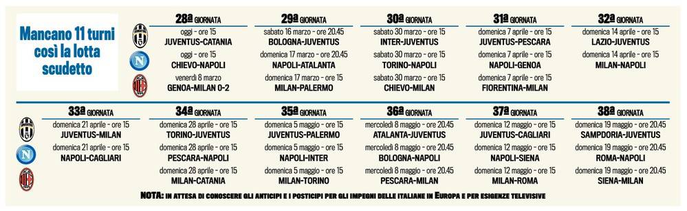 FOTONOTIZIA – Il quotidiano Tuttosport ha pubblicato stamane un’interessante fotonotizia per mostrare i prossimi 11 incontri, gli ultimi che mancano prima della fine della stagione, di Milan, Juventus e Napoli. Il giornale torinese titola “Corsa scudetto”, ma è chiaro per ora i rossoneri corrono per il secondo posto in sfavore del Napoli. Se poi eventualmente i bianconeri dovessero perdere altri punti, a quel punto, tutto potrebbe essere possibile…
