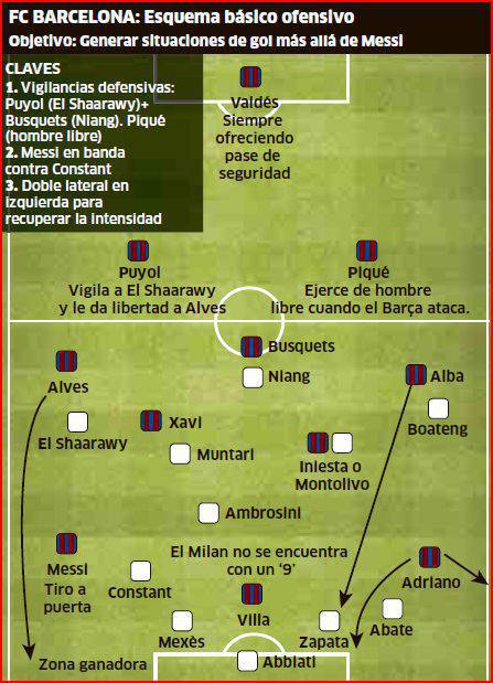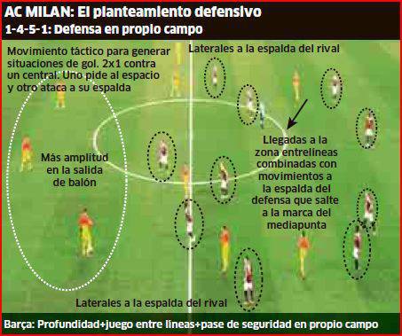 BARCELLONA MILAN – Interessante articolo pubblicato stamane dal quotidiano spagnolo Marca. I colleghi iberici hanno analizzato la fase difensiva del Milan attuata nella sfida contro il Barcellona dell’andata. Si sottolinea come in difesa il 4-3-3 rossonero si trasformi in un 4-5-1 che ingabbi i calciatori avversari. Davanti rimane solo il centravanti, in questo caso Niang, mentre El Shaarawy e Boateng arretrano sulla linea dei centrocampisti per spalleggiare Montolivo, Ambrosini e Flamini/Muntari. La difesa, naturalmente, rimane al suo posto. Di seguito le due grafiche molto esplicative.