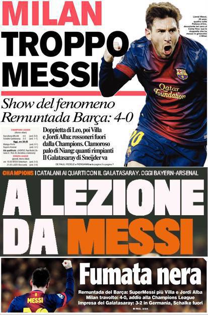 Rassegna stampa Milan: A lezione da Messi, fumata nera, Milan troppo Messi – Foto 13/03/2013 - 12:5013/03/2013 - 07:12 di Redazione2 RASSEGNA STAMPA MILAN FOTO – Di seguito potete trovare i principali titoli dei tre quotidiani sportivi, La Gazzetta dello Sport, Corriere dello Sport e Tuttosport, riguardanti naturalmente il nostro Milan. La redazione di Milanlive.it