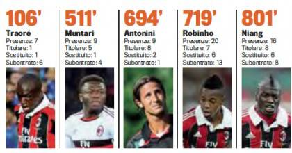 FOTONOTIZIA CALCIOMERCATO MILAN – La Gazzetta dello Sport ha pubblicato stamane una grafica molto esaustiva che tiene conto del minutaggio di impiego dei calciatori rossoneri. Focus sui giocatori meno utilizzati (senza naturalmente contare quelli sbarcati a gennaio), e fra questi troviamo Traorè, Antonini e Robinho. Tre calciatori che quasi sicuramente lasceranno il Milan a gennaio proprio per lo scarso inutilizzo. Fra i meno utilizzati da Allegri anche Sulley Muntari, fermo però ai box per infortunio, e anche M’Baye Niang, che in estate rimarrà sicuramente a Milanello, essendo considerato insieme a Balotelli ed El Shaarawy uno dei punti fissi dell’attacco del Diavolo del futuro.