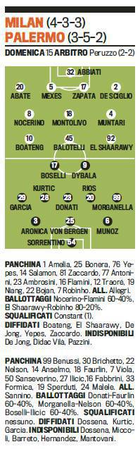 MILAN PALERMO PROBABILI FORMAZIONI – Poco più in basso potrete visionare le probabili formazioni di Milan-Palermo firmate Gazzetta dello Sport, sfida che si terrà domenica pomeriggio alle ore 15.00 in quel dello stadio San Siro. Allegri dopo la Champions ritrova Balotelli mentre dovrà fare ancora a meno di Pazzini, pronto solo per fine mese dopo il problema al perone. In difesa si rivede De Sciglio mentre a centrocampo spazio a Nocerino, Montolivo e Muntari. Assente Constant per squalifica nonché De Jong e Didac Vila per infortuni vari.