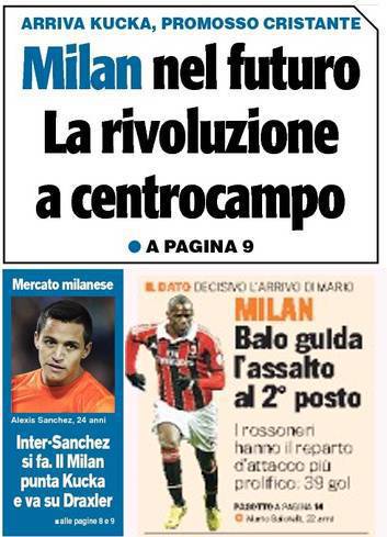 Rassegna stampa Milan: rivoluzione a centrocampo, Kucka, Draxler e Cristante, Balo guida l’assalto al 2° posto – Foto 16/03/2013 - 14:0316/03/2013 - 07:06 di Redazione2 RASSEGNA STAMPA MILAN FOTO – Di seguito potete trovare i principali titoli dei tre quotidiani sportivi, La Gazzetta dello Sport, Corriere dello Sport e Tuttosport, riguardanti naturalmente il nostro Milan. La redazione di Milanlive.it