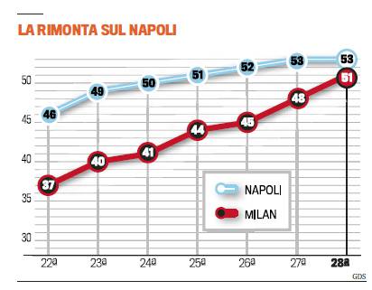 FOTONOTIZIA – E’ incredibile la scalata del Milan verso il secondo posto. Il club rossonero è riuscito a “mangiare” ben 7 punti nelle ultime sei giornate nei confronti del Napoli. Alla 22esima giornata il Diavolo si trovava infatti a quota 37 contro i 46 del Napoli. Ora la squadra dista solo due lunghezze da una posizione che sembrava quasi irraggiungibile pochi mesi fa…