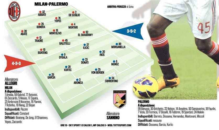MILAN PALERMO PROBABILI FORMAZIONI – Il Milan scenderà in campo questo pomeriggio alle ore 15.00 allo stadio San Siro per sfidare il Palermo. Allegri pensa ad una squadra molto diversa rispetto a quella vistasi all’opera martedì scorso al Camp Nou, a cominciare, come è ovvio, dal ritorno di Balotelli, che affiancherà Boateng ed El Shaarawy (anche se quest’ultimo non è al 100% e potrebbe giocare Robinho) in attacco. A centrocampo, grande novità Traore al fianco di Montolivo e Muntari. Sorprese anche in difesa, con la partenza dal primo minuto di Daniele Bonera, spalleggiato da Yepes, mentre sulla sinistra, vista la squalifica di Constant, toccherà a De Sciglio. Infine Abate sulla destra e Abbiati in porta.