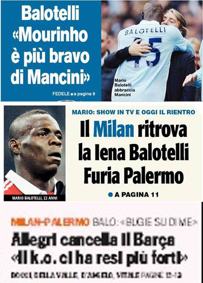 Rassegna stampa Milan: Il Milan ritrova la Iena Balotelli, Allegri cancella il Barcellona – Foto 18/03/2013 - 15:5817/03/2013 - 07:56 di Redazione2 RASSEGNA STAMPA MILAN FOTO – Di seguito potete trovare i principali titoli dei tre quotidiani sportivi, La Gazzetta dello Sport, Corriere dello Sport e Tuttosport, riguardanti naturalmente il nostro Milan. La redazione di Milanlive.it