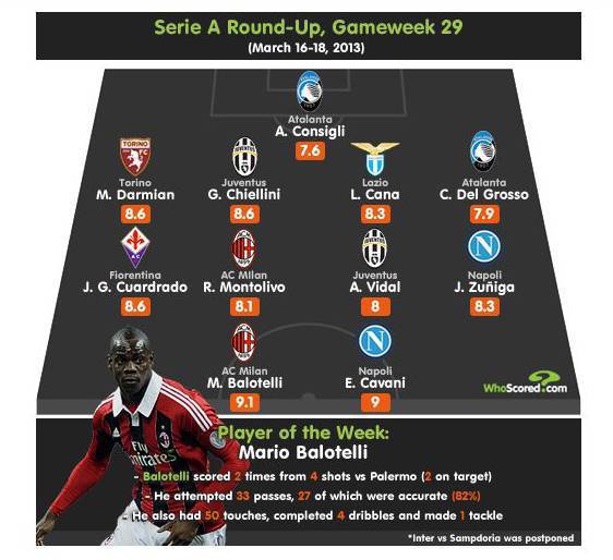 SERIE A BALOTELLI – Il sito Whoscored.com ha stilato la lista del best 11 della giornata di Serie A da poco passata, la 29esima. Due i rossoneri presenti e precisamente l’attaccante Mario Balotelli e il centrocampista Riccardo Montolivo. Super Mario è stato eletto anche il miglior giocatore in assoluto della giornata.