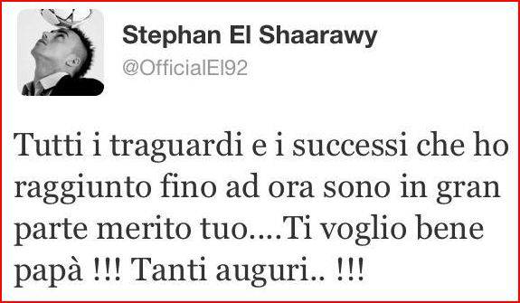 FESTA DEL PAPA’ – In occasione della festa del Papà di quest’oggi anche il nostro attaccante Stephan El Shaarawy ha voluto mandare un bell’augurio al padre tramite il proprio profilo Twitter. Di seguito quanto scritto dal giovane italo-egiziano, una frase davvero d’amore e toccante.