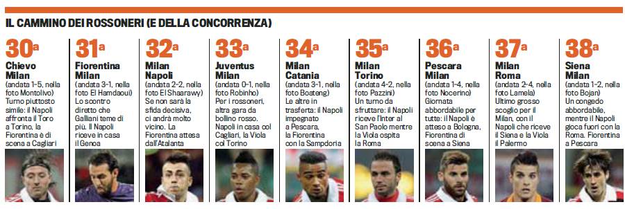 CORSA CHAMPIONS LEAGUE – Ancora 9 giornate poi il campionato 2012-2013 di Serie A andrà definitivamente in archivio. Il Milan è in piena corsa per un posto in Champions League, trovandosi attualmente al terzo posto a meno due dal Napoli. Nel contempo dovrà però vedersi dal ritorno arrembante della Fiorentina, letteralmente rinata dopo un autunno ed un inizio inverno di magra. Stamane La Gazzetta dello Sport ha pubblicato una foto esplicativa per mostrare i prossimi impegni di Milan, Fiorentina e Napoli, nella corsa al secondo/terzo posto: eccola di seguito.