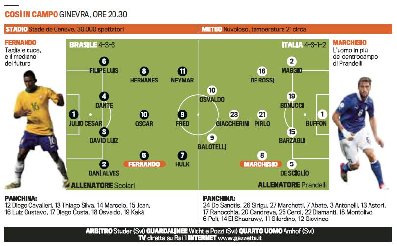 PROBABILI FORMAZIONI BRASILE ITALIA – Poco più in basso potrete visionare le probabili formazioni di Brasile-Italia firmate Gazzetta dello Sport, sfida che si giocherà questa sera alle ore 20.30 a Ginevra, amichevole internazionale di lusso. Ct Prandelli sceglie il duo Balotelli-Osvaldo lasciando a riposo El Shaarawy, probabilmente in vista della gara contro Malta. In casa verdeoro, invece, riflettori su Neymar, la stella indiscussa della Selecao, mentre l’ex rossonero Ricardo Kakà partirà dalla panchina. Anche Abate e Montolivo, infine, si accomoderanno sulla panca, in vista della gara valevole per la qualificazione ai Mondiali 2013.