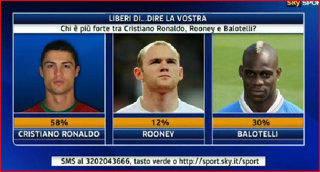 SONDAGGIO BALOTELLI – Sondaggio attualmente in corso su Sky Sport 24 per decidere chi è il giocatore più forte attualmente in circolazione. Presente anche il nostro Balotelli dopo le grande performance con la maglia del Milan e della nazionale. Balotelli, in questa tornata, se l’è vista contro Cristiano Ronaldo e Rooney: di seguito il risultato del sondaggio.