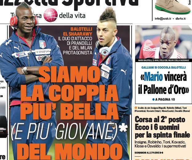 Rassegna stampa Milan: “Siamo la coppia più bella e giovane del mondo”, Mario vincerà il Pallone d’Oro, Robinho… – Foto 25/03/2013 - 15:5624/03/2013 - 08:04 di Redazione2 RASSEGNA STAMPA MILAN FOTO – Di seguito potete trovare i principali titoli dei tre quotidiani sportivi, La Gazzetta dello Sport, Corriere dello Sport e Tuttosport, riguardanti naturalmente il nostro Milan. La redazione di Milanlive.it