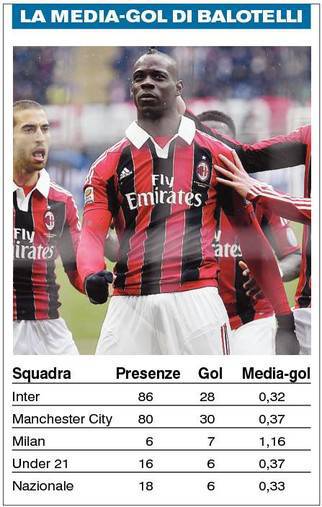 FOTONOTIZIA BALOTELLI – Interessante fotonotizia pubblicata dal quotidiano Corriere dello Sport per sottolineare la straordinaria media gol di Balotelli. Super Mario sta viaggiando a numeri paurosi sia in Nazionale quanto con il Milan in questo 2013. I numeri anche con Inter, City e Under-21 non sono comunque affatto male…