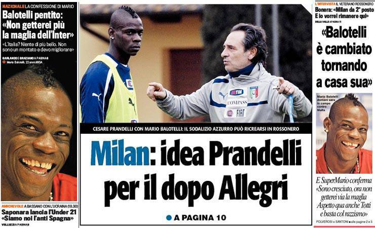 Rassegna stampa Milan: idea Prandelli per il post-Allegri, Balotelli pentito e cambiato – Foto 25/03/2013 - 15:5525/03/2013 - 07:11 di Redazione2 RASSEGNA STAMPA MILAN FOTO – Di seguito potete trovare i principali titoli dei tre quotidiani sportivi, La Gazzetta dello Sport, Corriere dello Sport e Tuttosport, riguardanti naturalmente il nostro Milan. La redazione di Milanlive.it