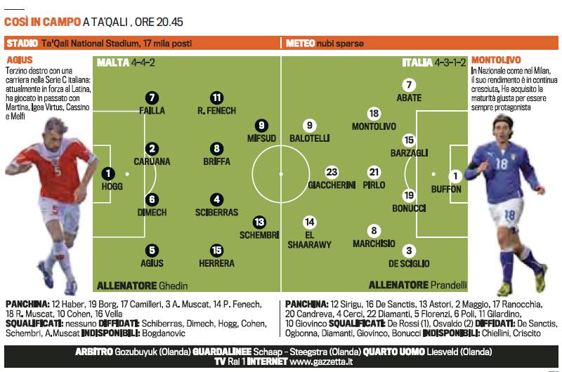 MALTA ITALIA PROBABILI FORMAZIONI – Di seguito potete trovare le probabili formazioni di Malta-Italia firmate Gazzetta dello Sport, sfida che si terrà questa sera alle ore 20.30 a Malta e che sarà valida per la qualificazione ai Mondiali in Brasile del 2014. Il commissario tecnico Cesare Prandelli ha di fatto confermato la volontà di schierare i due blocchi juventini e milanisti per il match odierno. I rossoneri presenti saranno 5 e precisamente i due attaccanti El Shaarawy e Balotelli, i due terzini Abate e De Sciglio, e Montolivo a centrocampo. A completare l’11, Giaccherini, Pirlo, Marchisio, Bonucci, Barzagli e Buffon.